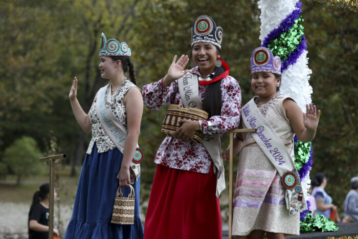 2024-25 Junior Miss Cherokee Misha Slee, 2024-25 Teen Miss Cherokee Dvdaya Swimmer, and 2024-25 Little Miss Cherokee Faith Panther are shown in the 113th Cherokee Indian Fair Parade in Cherokee, N.C. on Tuesday, Oct. 7, 2025. (SCOTT MCKIE B.P./One Feather photo)