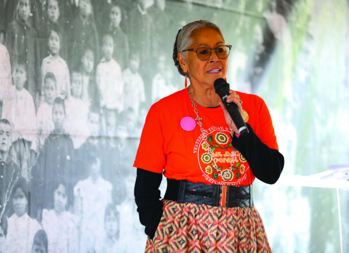 Patty Grant, an elder of the Eastern Band of Cherokee Indians, speaks about historical grief and trauma during the National Day for Truth & Reconciliation event held in Cherokee, N.C. on the morning of Tuesday, Sept. 30. The event featured a walk and informative speeches on the subject of Indian Boarding Schools, specifically the Cherokee Boarding School. (SCOTT MCKIE B.P./One Feather photos)