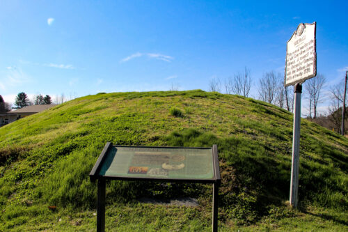 It continues, “At the heart of Noquisiyi on the banks of the Little Tennessee River, the town’s meeting hall once towered over the landscape, built atop the mound which was formed by Cherokee women carrying baskets of soil to that location. Today, Noquisiyi Mound, the settlement’s only surviving landmark, rises as the gateway to Franklin.”