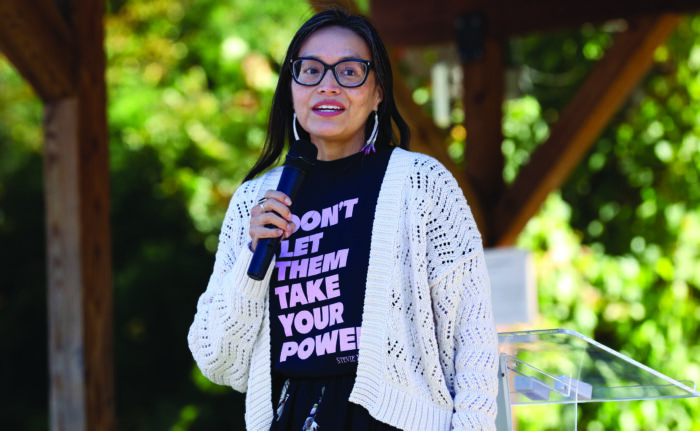Aniwodihi (Painttown) Rep. Shannon Swimmer, a domestic violence survivor, speaks during the Purple Lotus Day event held at the Cherokee Welcome Center in Cherokee, N.C. on the afternoon of Wednesday, Oct. 22. The event, presented by the Eastern Band of Cherokee Indians Domestic Violence & Sexual Assault Program, featured speeches and information on domestic violence and MMIP (Missing and Murdered Indigenous People) in recognition of October being Domestic Violence Awareness Month. (SCOTT MCKIE B.P./One Feather photos)