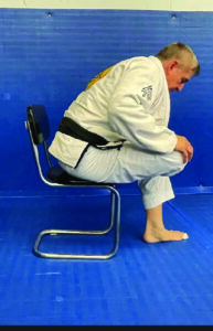 Make sure your chair is supported against a wall or your desk. Place one knee on the chair and keep your other foot firmly planted on the ground. Gently straighten your back and push your pelvis forward to feel a stretch in the front part of your thigh and groin area, roughly in front of your pants pockets. Hold for 30 seconds then repeat on the other side. After a long period of sitting at your work desk or a long car drive, the tightening of this whole area is what will have you hunched over when you initially stand up. Stretching it out first will save you a little time from having to walk hunched over as you take your first steps rising from sitting.