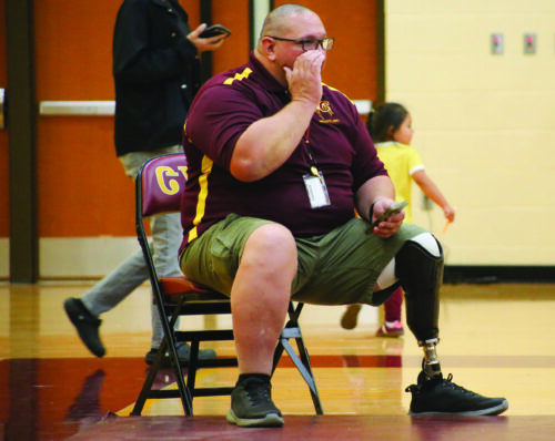 Todd Odom, Cherokee High School head wrestling coach, gives instructions during the Maroon and Gold intrasquad scrimmage on the evening of Thursday, Nov. 6 in the Charles George Memorial Arena. (BROOKLYN BROWN/One Feather photo)