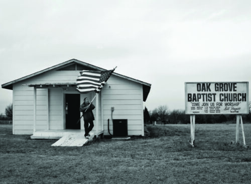 Also included in the book is this photo by Tom Fields. Bill Frazier, a Chickasaw pastor and a U.S. Marine Corps veteran, places his American flag on the sign outside Oak Grove Baptist Church building, Roff, Oklahoma, 2010. © Tom Fields