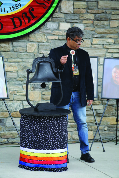 Bo Lossiah, manager of the Kituwah Preservation Education Program (KPEP), rings the memorial bell for the six speakers who passed in 2025 during the second Tsalagi Aniwonisgi Didanvdadisdi (Cherokee Speakers Memorial Day) event was held on the morning of Tuesday, Nov. 25 at the Kalvgviditsa Tsalagi Aniwonisgi Tsunatsohisdihi (Cherokee Speakers Place). (BROOKLYN BROWN/One Feather photos)