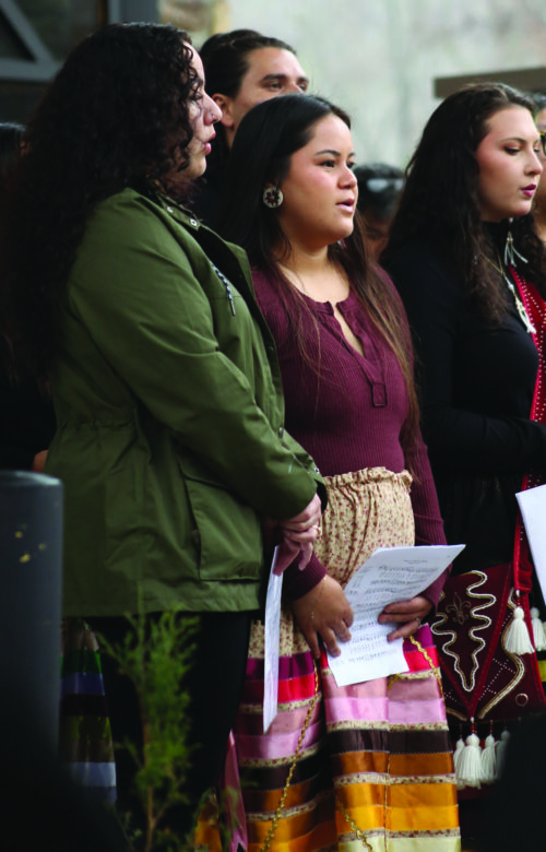 Meona Feather, middle, is showing singing a Cherokee hymn with the Cherokee Language Master Apprentice Program (CLMAP) at the 2026 Cherokee Speakers Memorial Day Event. (BROOKLYN BROWN/One Feather Photo)