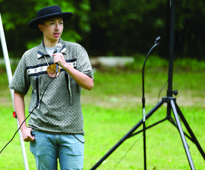 Dallas Bennett, a member of the Eastern Band of Cherokee Indians who serves as the constituent services representative in the Office of Taline Ugvwiyu (Vice Chief) Alan B. Ensley, speaks at the opening of the Fading Voices Demonstration Day in Tutiyi (Snowbird) near Robbinsville, N.C. on the morning of May 24, 2025. (SCOTT MCKIE B.P./One Feather photo)