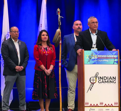 EBCI Ugvwiyuhi (Principal Chief) Michell Hicks, shown at podium, was elected on Wednesday, April 1 as treasurer of the Indian Gaming Association (IGA). (Photo contributed)