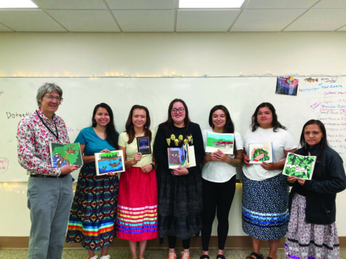 Dr. Hartwell Francis, Meshay Long, Aaliyah Swimmer, Elvia Walkingstick, Michelle Long, Madison Long, and Olivia Owle pose with their 2025 Impact Award for Community-Engaged Teaching, Learning & Research presented by the WCU Center for Community Engagement and Service Learning on Monday, April 28, 2025 for their children’s book project in collaboration with WCU professor Tatiana Potts and her printmaking class. (Photo contributed)