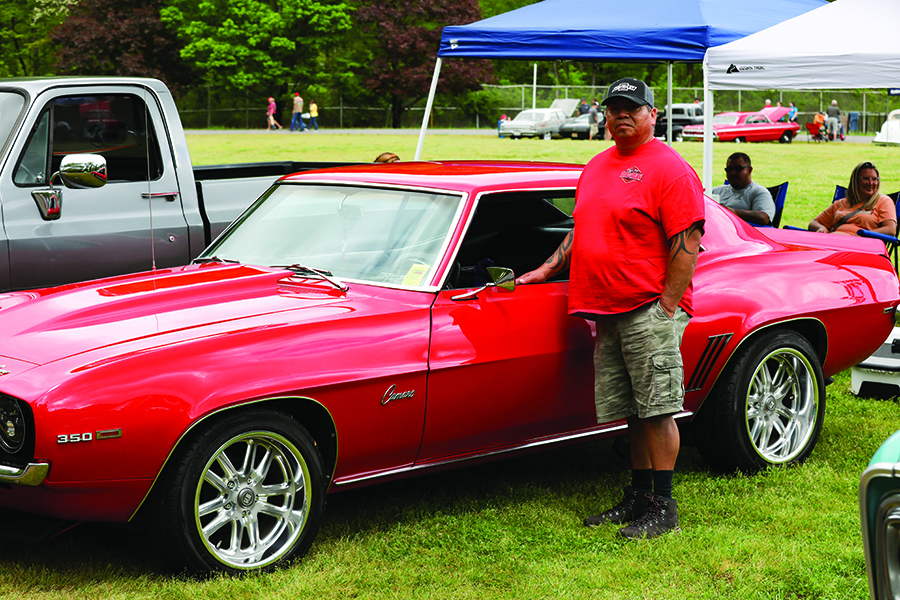 Calloway Ledford, a member of the Eastern Band of Cherokee Indians, poses beside his 1969 Camaro at the 2025 Cruise the Smokies Cherokee Spring Rod Run held at the old Cherokee High School site in Cherokee, N.C. on April 26, 2025. (SCOTT MCKIE B.P./One Feather photo)