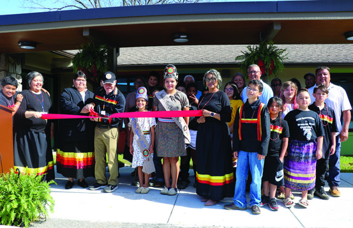 Along with tribal leaders of the Eastern Band of Cherokee Indians and students from the Center, Leslie McEntire and Anthony Swearengin cut the ribbon to officially open the Cherokee Boys Club Child Development John H. Gloyne Agelink Center in Cherokee, N.C. on the morning of Friday, April 17. (SCOTT MCKIE B.P./One Feather photos)