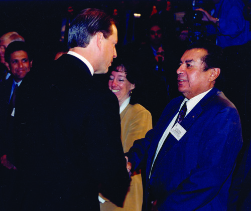 Frank Blythe, right, founding executive director of what would become Vision Maker Media, is shown meeting with former vice president Al Gore.