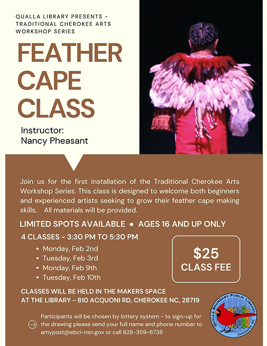 Feather Cape Class. Begins Feb 2 from 3:30pm – 5:30 p.m.in the Maker Space at the Qualla Boundary Public Library 810 Acquoni Rd. Cherokee, NC. 28719.  Limited spots available call to sign up by Thursday. Jan. 22. Lottery draw will be held on Friday, Jan. 23. Cost $25 Info: (828) 359-6738