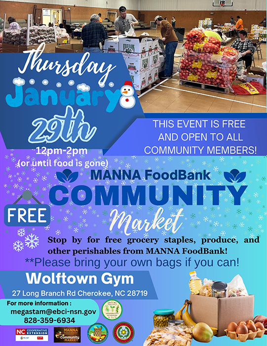 MANNA Foodbank Community Market. Jan. 29 from 12 p.m. – 2 p.m. at the Wolftown Gym 27 Long Branch rd., Cherokee, NC. 28719. Stop by for free grocery staples, produce and other perishable items. Bring your Own bags. Free and Open to all community members. Info: megastam@ebci-nsn.gov or (828) 359-6934