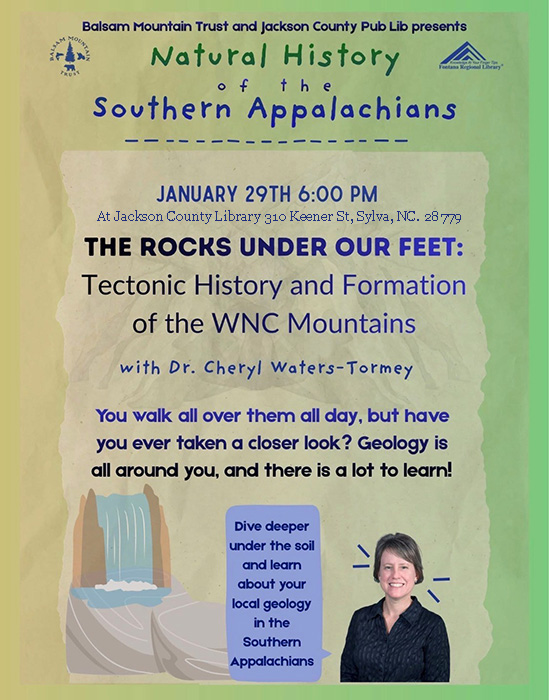 Local Geology. Jan. 29 at 6 p.m. at the Jackson County Library 310 Keener St., Sylva, NC. 28779. Learn about local geology with Dr. Waters- Tormey.  With over 20 years’ experience teaching and researching geology of the Southern Appalachians as a professor at Western Carolina University. Her main interests are in how rocks formed deep in tectonics plates develop fracture systems as they are brought to the surface by tectonic events.  Hosted by the Balsam Mountain Trust. Info: (828) 586-2016.