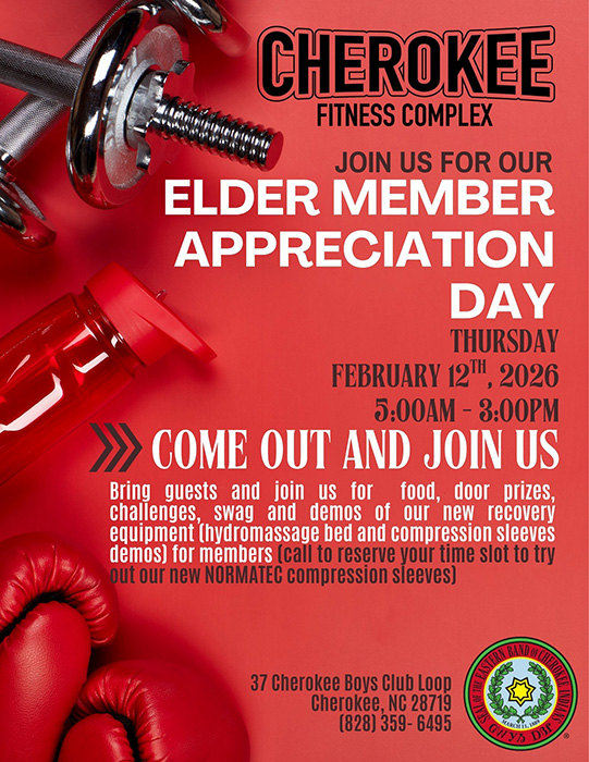 Elder Member Appreciation Day. Feb. 12  from 5 a.m – 3 p.m. at the Cherokee Fitness Complex 37 Cherokee Boys Club Loop Cheroke, NC. 28719. Come out, bring a friend, there will be food, door prizes, challenges, swag and demonstrations of the new recovery equipment (hydromassage beds and compression sleeves, call to reserve your time slot to try the new NORMATEC compression sleeves). INFO: (828) 359-6495.