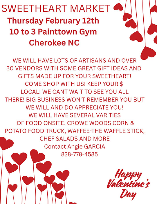 Sweetheart Market. Feb. 12 from 10a.m. –  3 p.m. at the Pam Taylor Gym 10 Old Gap Rd., Cherokee, NC. 28719. Over 30 vendors, gifts for your sweetheart. Several varieties of food onsite. INFO: Angie Garcia (828) 778-4585.