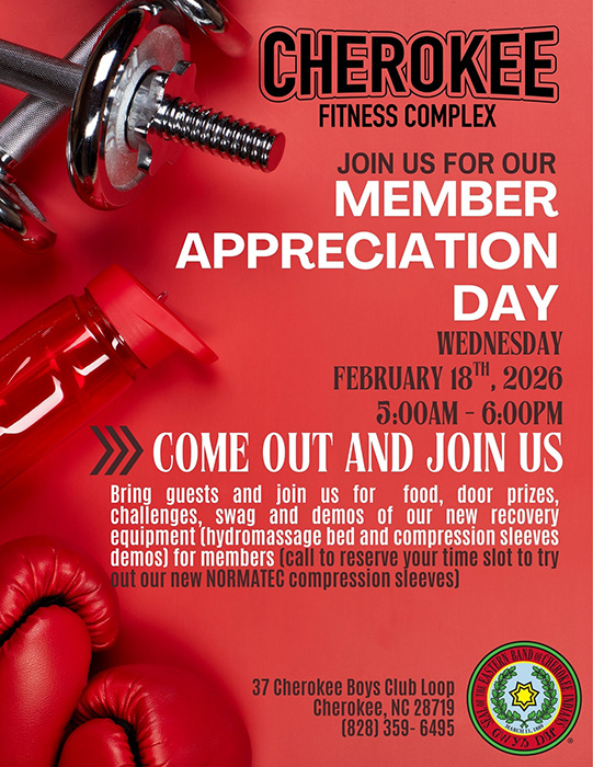 Member Appreciation Day. Feb. 18  from 5 a.m – 6 p.m. at the Cherokee Fitness Complex 37 Cherokee Boys Club Loop Cheroke, NC. 28719. Come out, bring a friend, there will be food, door prizes, challenges, swag and demonstrations of the new recovery equipment (hydromassage beds and compression sleeves, call to reserve your time slot to try the new NORMATEC compression sleeves). INFO: (828) 359-6495.