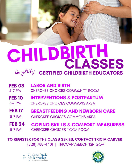 Childbirth Classes. Feb. 3, 10, 17 & 24 from 5 p.m. – 7 p.m. in the Cherokee Choices Community Room 806 Acquoni Rd, Cherokee, NC. 28719. Info: Tricia Carver (828) 788-4401 email triccarv@ebci-nsn.gov
