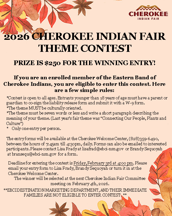 2026 Cherokee Indian Fair Theme Contest. Deadline Feb. 3 at 4 p.m. Prize is $250 for winning entry. Enrolled members of the Eastern Band of Cherokee Indians are eligible to enter. Rules: open to all ages, entrants younger than 18 must have a parent or guardian co-sign the liability release form and along with the W9. Theme must be culturally oriented. Theme must be seven words or less and write a short paragraph describing the meaning of your theme. Only one entry per person. Entry forms available at the Cherokee Welcome Center (828) 359-6490 Emailed forms can  be emailed contact: Lisa Frady at lisafrady@ebci-nsn.gov or brandy Sequoyah at bransequ@ebci-nsn.gov. Winner will be selected at the next Cherokee Indian Fair Committee meeting on Feb. 4. *EBCI Destination marketing department and their immediate families are not eligible to enter.*