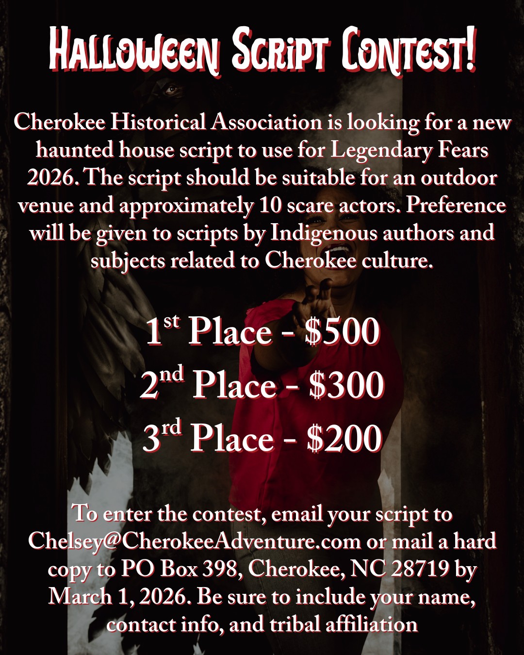 Halloween Script Contest. Submit by March 1. Cherokee Historical Association is looking for a new haunted house script to use for Legendary Fears 2026. Should be suitable for outdoor venue and approximately 10 scare actors. Preference will be given to scripts by Indigenous authors and subject related to Cherokee culture. Info: Chelsey@CherokeeAdventure.comm