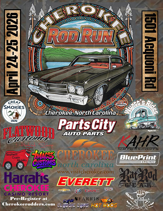Spring Rod Run. April 24- 25 Old Cherokee High School Site, 1501 Acquoni Rd., Cherokee, NC. 28719 Thousands in Cash Giveaways, Early Bird Show and Shine Thursday after Lunch, Tool Box and Cooler Scooter Raffles, 50/50, Cruise Thru the Great Smokies National Park, Participant Meal, Valve Cover Racing, Model Car Contest, Vendors, Swap Meet, Food Vendors, Home Built Trophies, and More!! Pre-Register before April 10th and be entered for a huge cash prize!!! INFO: Cherokeerodders.com