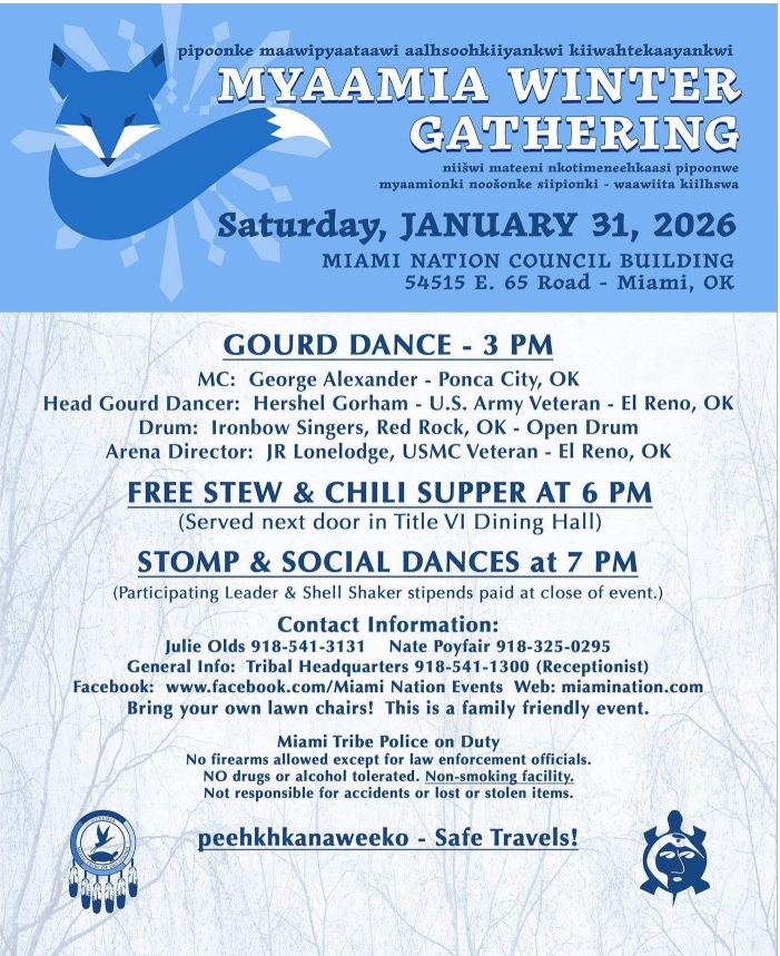 Myaami Winter Gathering. Jan. 31 at the Miami Nation Council Building in Miami, Okla. MC: George Alexander. Host Drum: Ironbow. Info: Julie Olds (918) 541-3131, Nate Poyfair (918) 325-0295, https://miamination.com/