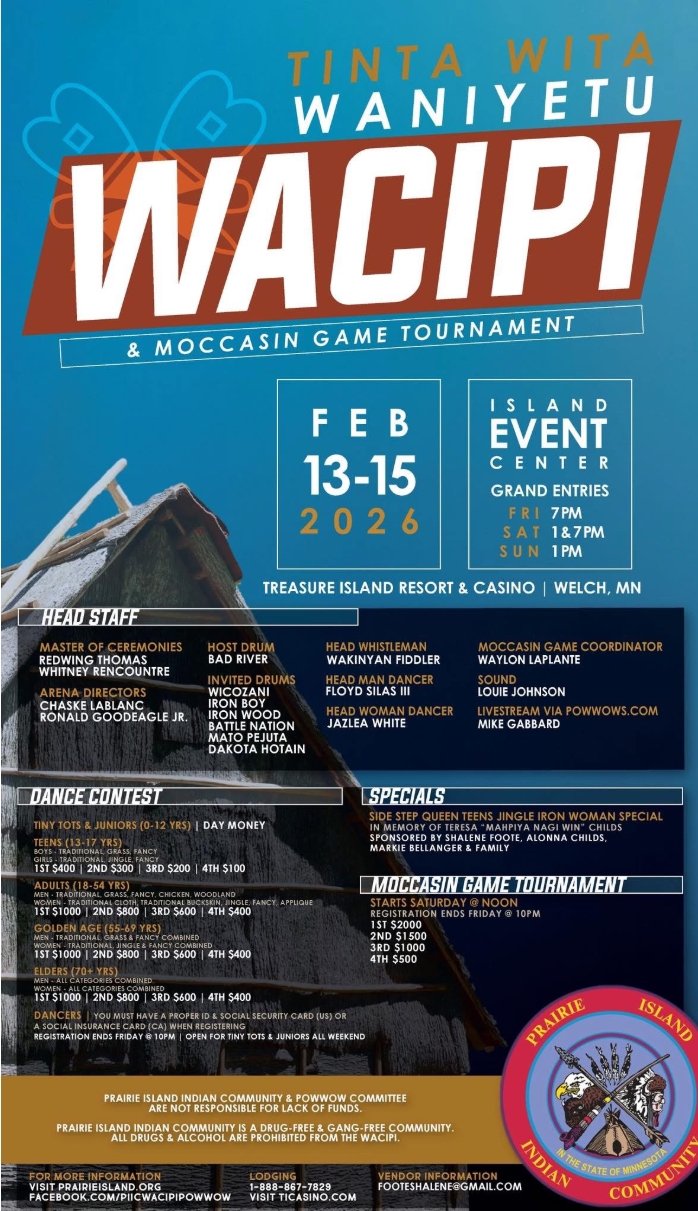 Prairie Island Waniyetu Wacipi. Feb. 13-15 at the Treasure Island Resort & Casino Event Center in Welch, Minn. Emcees: Whitney Rencountre and Redwing Thomas. Host Drum: Bad River. Invited Drums: The Descendants, Hay Creek, Ironwood, Smokeytown, Bad Nation. Info: https://prairieisland.org