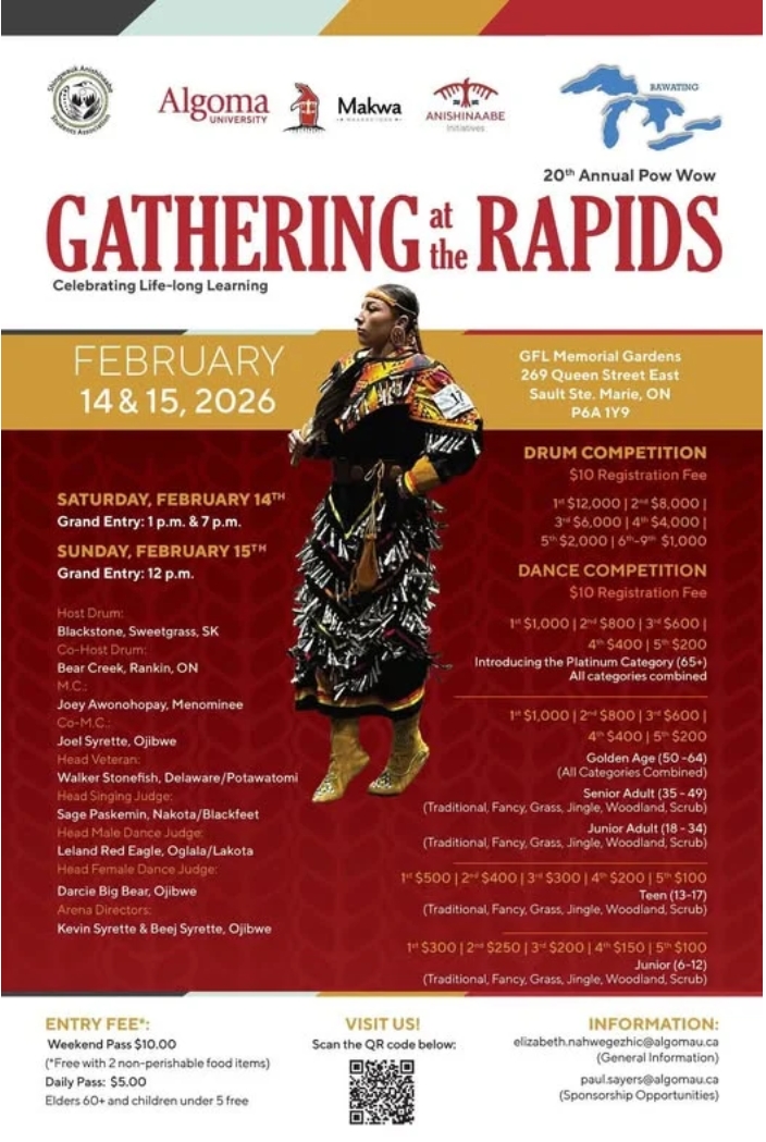 20th Annual Gathering at the Rapids. Feb. 14-15 at GLF Memorial Gardens in Sault Ste. Marie, Ontario, Canada. MC: Joey Awonohopay. Host Drum: Blackstone. Co-Host Drum: Bear Creek. Info: Elizabeth.nahwegezhic@algomau.ca