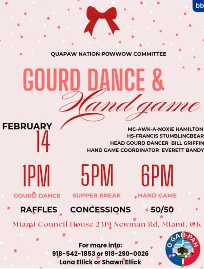 Quapaw Nation Gourd Dance and Hand Games. Feb. 14 at Miami Council House in Miami, Okla. MC: Awk-A-Noxie Hamilton. Info: Lane Ellick (918) 543-1853 or Shawn Ellick (918) 290-0026