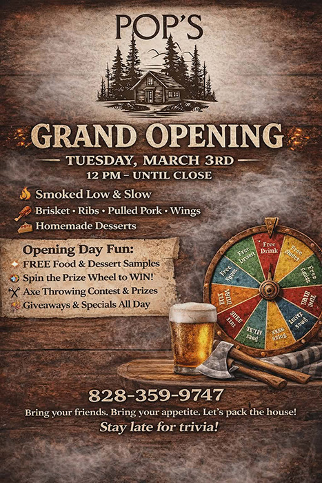 Grand Opening Pops Smokehouse. March 3, 12 p.m. – close. Pops Smokehouse 984 Tsalagi rd., Cherokee, NC. 28719. Opening day fun: FREE food & desser samples, spin prize wheel, axe throwing contest & prizes, giveaways and specials all day. Stay late for trivia. Info: (828) 359-9747