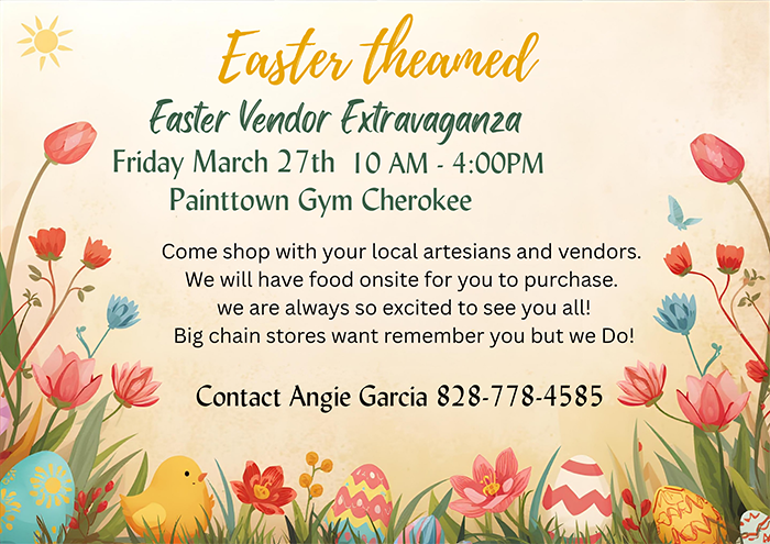 Easter Vendor Extravaganza. March 27 from 10a.m – 4 p.m. at the Pam Taylor Painttown Gym 10 Old Gap Rd., Cherokee, NC. 28719. Come shop with your local artesians and vendors. There will be food onsite. INFO: Angie Garcia (828) 778-4585.