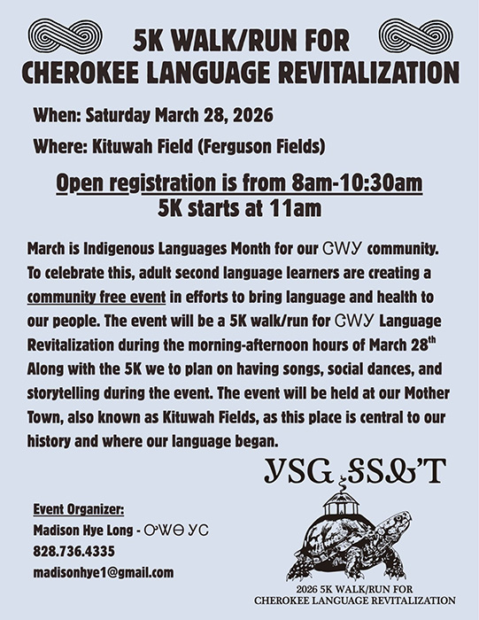 5K Walk/ Run for Cherokee Language Revitalization. March 28 registration starts at 8 a.m. 5K starts at 11 a.m.at Kituwah Mothertown 3831 Ela Rd., Bryson City, NC. 28713. Along with the 5K, there will also be songs, social dances and storytelling. INFO: Madison Hye Long (828) 736-4335 or madisonhye1@gmail.com