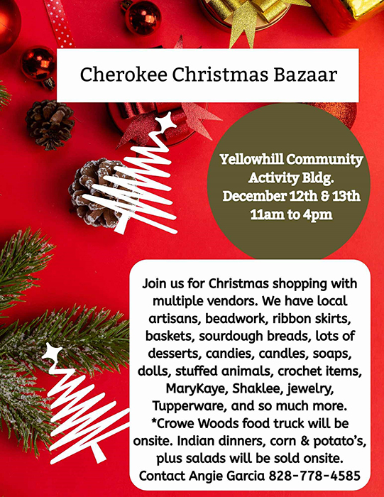 Cherokee Christmas Bazaar.Dec. 12 and 13 from 11 a.m. – 4 p.m. at the Yellowhill Community Activity Building 1416 Acquoni Rd Cherokee, NC. 28719. Enjoy Christmas shopping with multiple vendors. Contact Angie Garcia (828) 778-4585.