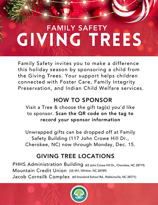 Family Safety Giving Trees. Now till Dec. 15 visit one of the Giving Tree locations, listed on flyer. Unwrapped gifts can be dropped off at Family Safety Building 117 John Crowe Hill Dr., Cherokee, NC. 28719. Family Safety invites you to make a difference this holiday season by sponsoring a child from the Giving tree.