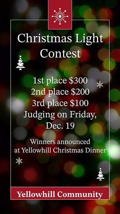 Yellowhill Community Christmas Lights Contest. Judging on Dec. 19, 1st place $ 300, 2nd place $200, 3rd place $100 winners announced at Yellowhill Christmas Dinner. To enter your house for judging, call Virginia at (828)788-8659.