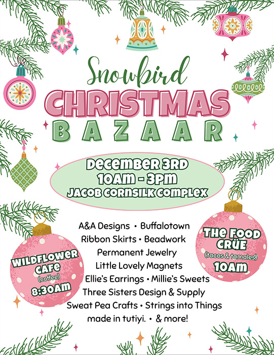 Snowbird Christmas Bazaar.Dec. 3 from 10 a.m. – 3 p.m. at the Jacob Cornsilk Complex 60 Snowbird School Rd., Robbinsville, NC. 28771. Wildflower Café (coffee) 8:30 a.m. and The Food Crue (tacos & tamales) at 10 a.m.