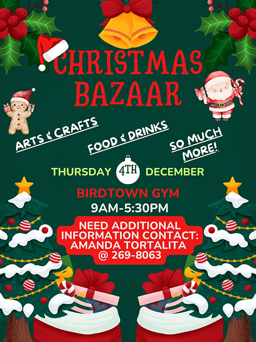 Birdtown Christmas Bazaar. Dec. 4 from 9 a.m. – 5:30 p.m. at the Peaches Squirrell Sports & Recreation Center 1212 Birdtown Rd. Cherokee, NC. 28719. Arts & Crafts, food & drinks, and so much more. More information call Amanda Tortalita (828) 269-8063.