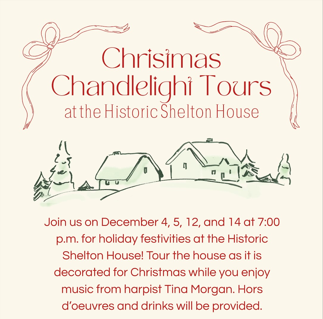 Christmas Candlelight Tours. Dec. 5, 6, 12, and 14 at 7:00 p.m. at Shelton House 49 Shelton St., Waynesville, NC. 28786, for an evening of fun. Tours begin at the front porch of the house, where you will be escorted inside to our dining room for drinks and hors d’ouvres. Additionally, harpist Tina Morgan will be playing live music for your enjoyment. After you get settled in, you will receive a tour of the house decorated for the holidays, illuminated by seasonal lights! Live foliage throughout the home, generously provided by the Waynesville Garden Club and Mountain View Garden Club, are sure to make you feel festive. Spaces for the tours are limited, so make sure you reserve your spot now by purchasing tickets. Call(828)452-1551.