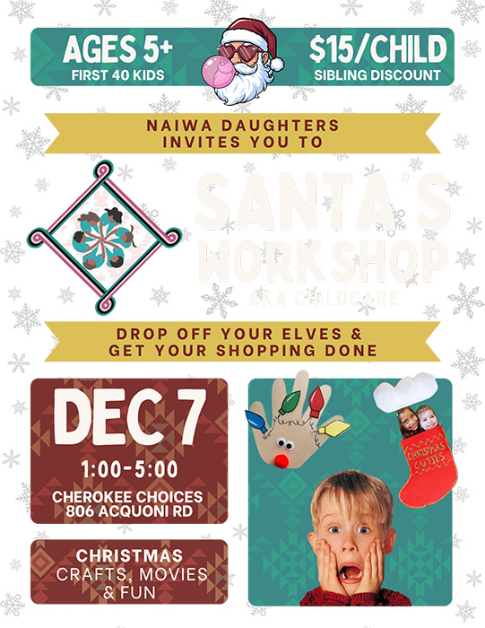 Christmas Childcare.Dec. 7 from 1 p.m. – 5 p.m. at Cherokee Choices 806 Acquoni Rd, Cherokee,NC. 28719. Ages 5+, $15 a child/ sibling discount. Christmas crafts, movies and fun, hosted by NAIWA Daughters.