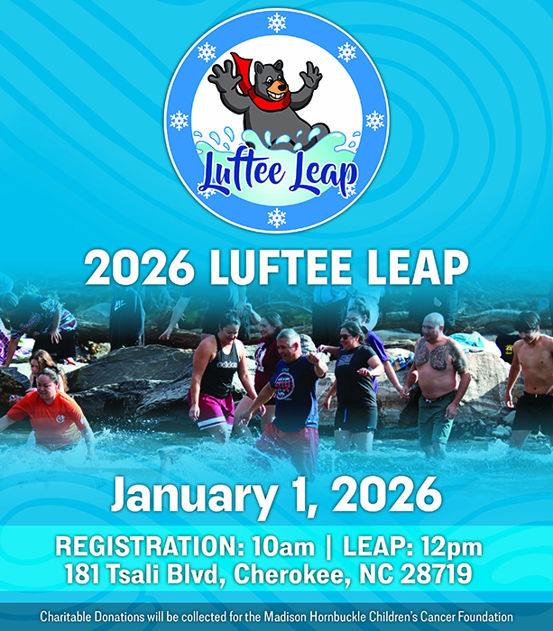 Luftee Leap. Jan. 1 registration starting at 10 a.m. leap at 12 noon. at UNITY Island Park 181 Tsali Blvd., Cherokee, NC. 28719. Donations will go to the Madison Hornbuckle Children’s Cancer Foundation.