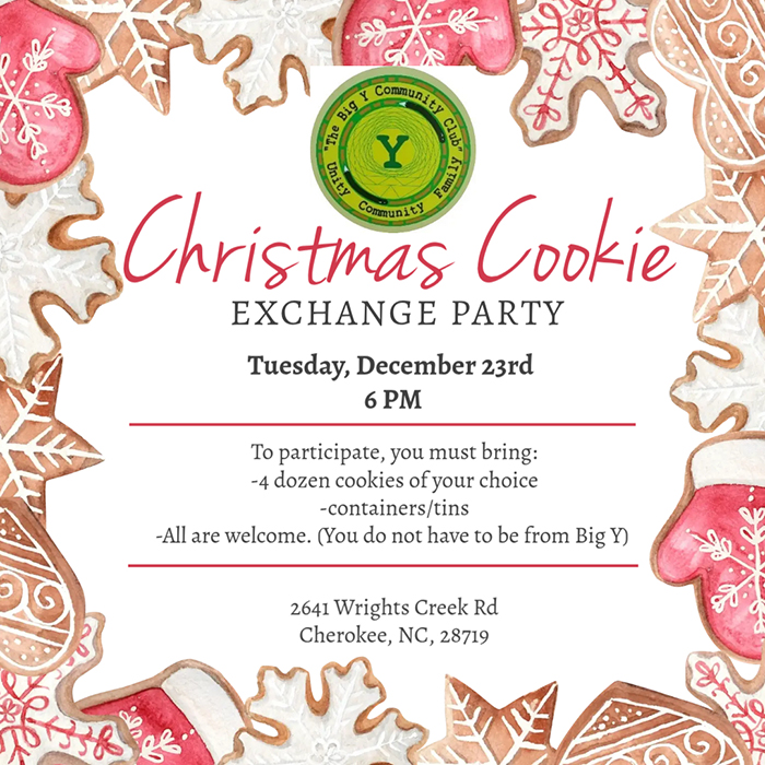 Christmas Cookies Exchange. Tuesday, Dec. 23 at 6 p.m. at Big Y Community Club 2641 wrights Creek Rd, Cherokee, N.C. 28719.