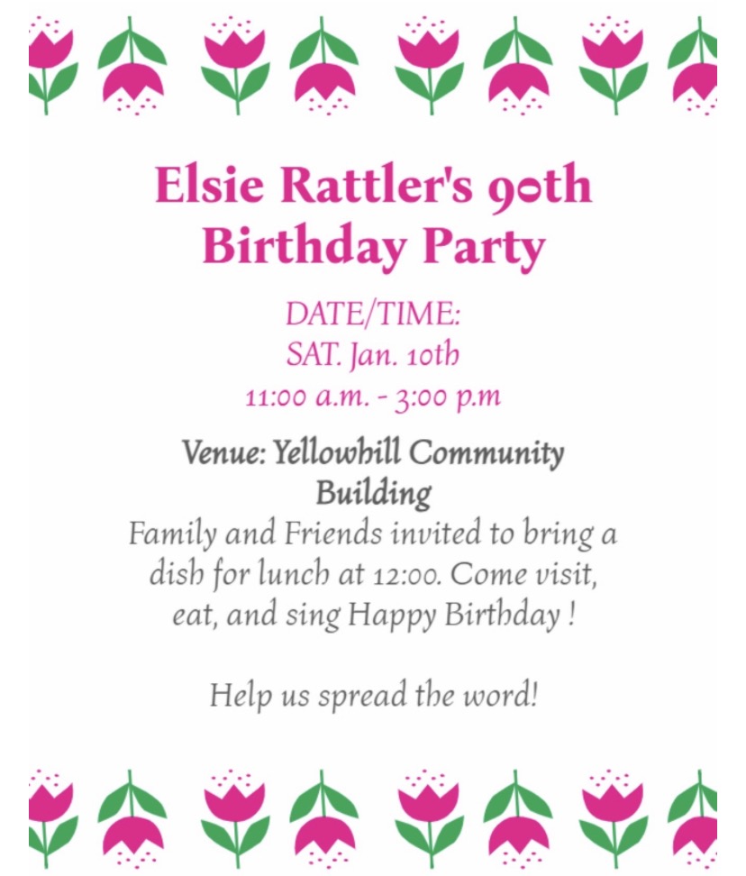 Elsie Rattlers 90th Birthday Party. Jan. 10 from 11 a.m. – 3 p.m. at the Yellowhill Community Activity Building. 1416 Acquoni Rd, Cherokee, NC. 28719. Family and Friends are invited to bring a dish for lunch at 12 p.m. Info: Raven Rattler (661) 221-2455
