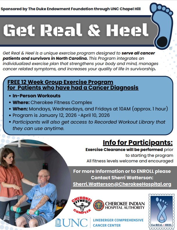 Get Real & Heal. Jan. 12 – April 10. Mon. Wed. & Fridays at 10 a.m. at the Cherokee Fitness Complex 810 Acquoni Rd., Cherokee, NC. 28719. FREE 12 week group exercise program for patients who have had a cancer diagnosis. Info: Sherri.Watterson@Cherokeehospital.org