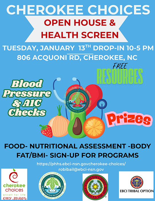 Open House & Health Screen. Jan. 13 from 10 a.m. – 5 p.m. at Cherokee Choices 806 Acquoni Rd., Cherokee, NC. 28719. Blood pressure and A1C checks, FREE resources, prizes, food-nutritional assessment, body fat/BMI – sign up for programs. INFO: robibail@ebci-nsn.gov