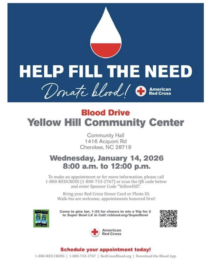 Blood Drive. Jan. 14 from 8 a.m. – 12 p.m. at the Yellowhill Activity Building, 14116 Acquoni Rd, Cherokee, NC. 28719. Info: 1-800-REDCROSS