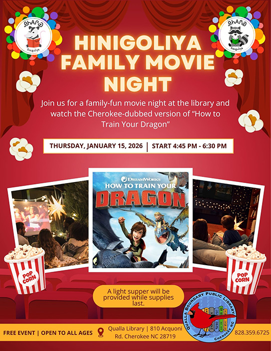 HINIGOLIYA Family Movie Night. Jan. 15 from 4:45 p.m. – 6:30 p.m. at the Qualla Boundary Public Library 810 Acquoni Rd. Cherokee, NC. 28719. Join us for a family-fun movie night at the library and watch the Cherokee dubbed version of “How to Train Your Dragon”. FREE event. Info: (828) 359-6725