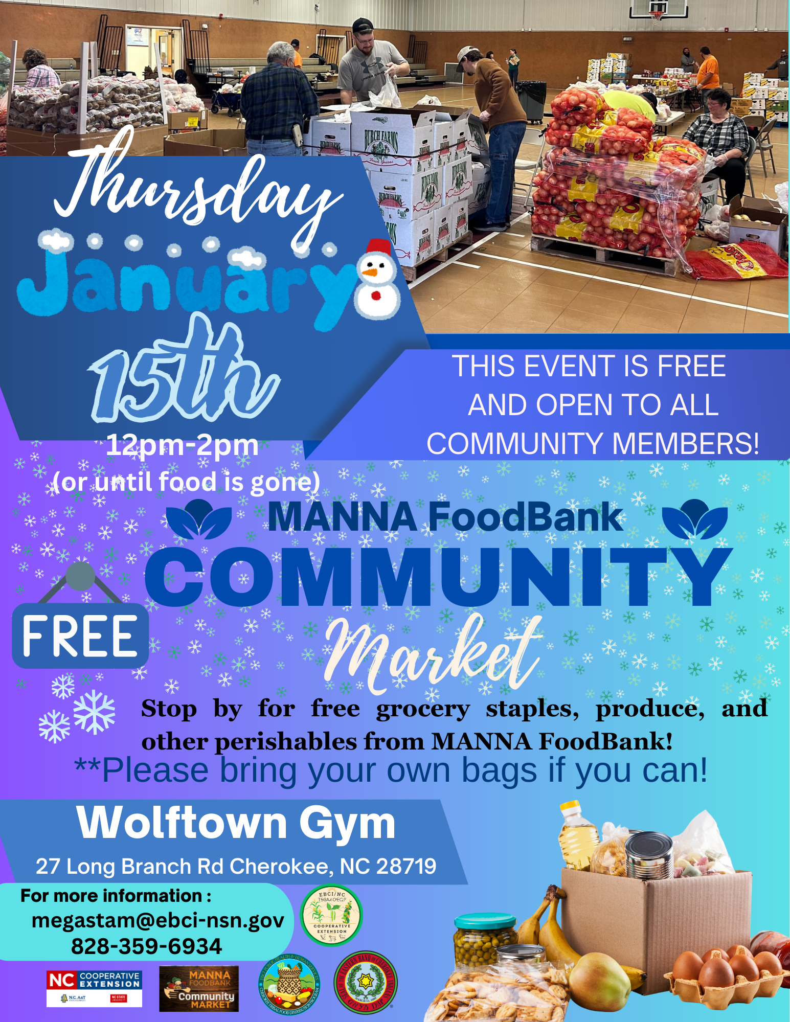 MANNA Foodbank. Jan. 15 from 12 p.m. – 2 p.m.at Wolftown Gym 27 Long Branch Rd., Cherokee, NC. 28719. FREE and open to all community members. Bring your own bags. Info: Megan Stamper (828) 359-6934