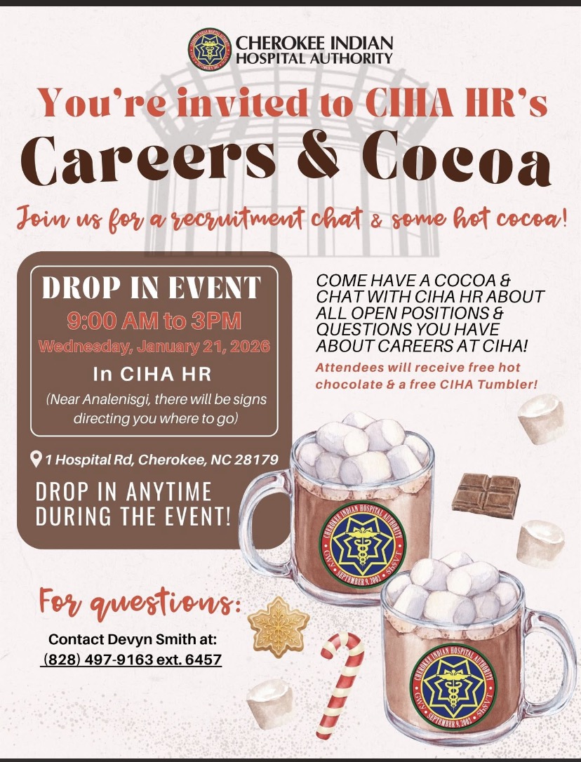 Careers & Cocoa. Jan. 21 from 9 a.m. – 3 p.m.at the Cherokee Indian Hospital HR, 1 Hospital Rd., Cherokee, NC. 28719. Have a chat about all open positions and questions you have about careers at Cherokee Indian Hospital. Info: Devyn Smith (828) 497-9163m ext 6457.