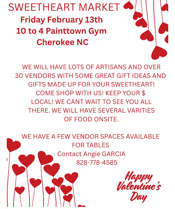Sweetheart Market. Feb. 13 from 10a.m. – 4 p.m. at the Pam Taylor Gym 10 Old Gap Rd., Cherokee, NC. 28719. Over 30 vendors, gifts for your sweetheart. Several varieties of food onsite. INFO: Angie Garcia (828) 778-4585.