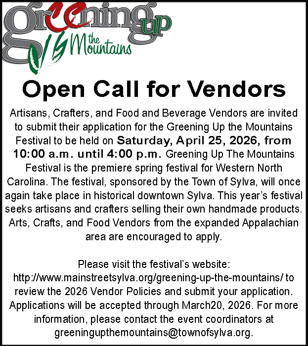 Calling all Vendors. Greening Up The Mountains is looking for Artisans, Crafters, and Food and Beverage Vendors to submit their application for the Greening Up the Mountains Festival to be held on Saturday, April 25, 2026, from 10:00 a.m. until 4:00 p.m.This year’s festival seeks artisans and crafters selling their own handmade products. Arts, Crafts, and Food Vendors from the expanded Appalachian area are encouraged to apply. Please visit the festival’s website: http://www.mainstreetsylva.org/greening-up-the-mountains/ to review the 2026 Vendor Policies and submit your application. Applications will be accepted through March20, 2026. For more information, please contact the event coordinators at greeningupthemountains@townofsylva.org.